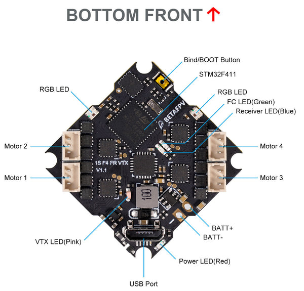 - F4 1S AIO FC(No Rx) not only integrates with the 25mW VTX but also supports a 1-2S power system, which is perfectly suitable for the weight-sensitive drone such as Meteor75 and Beta85 Pro2.