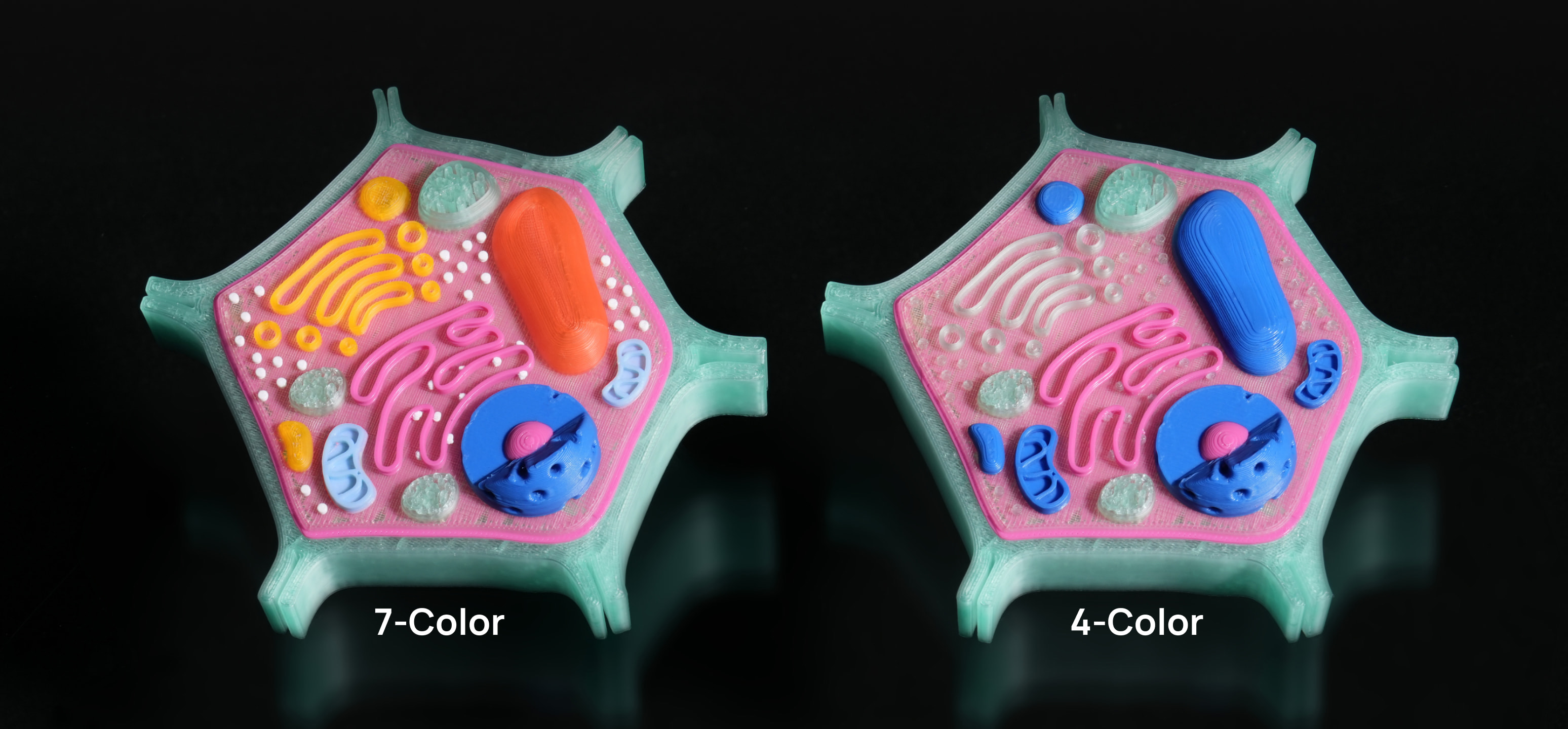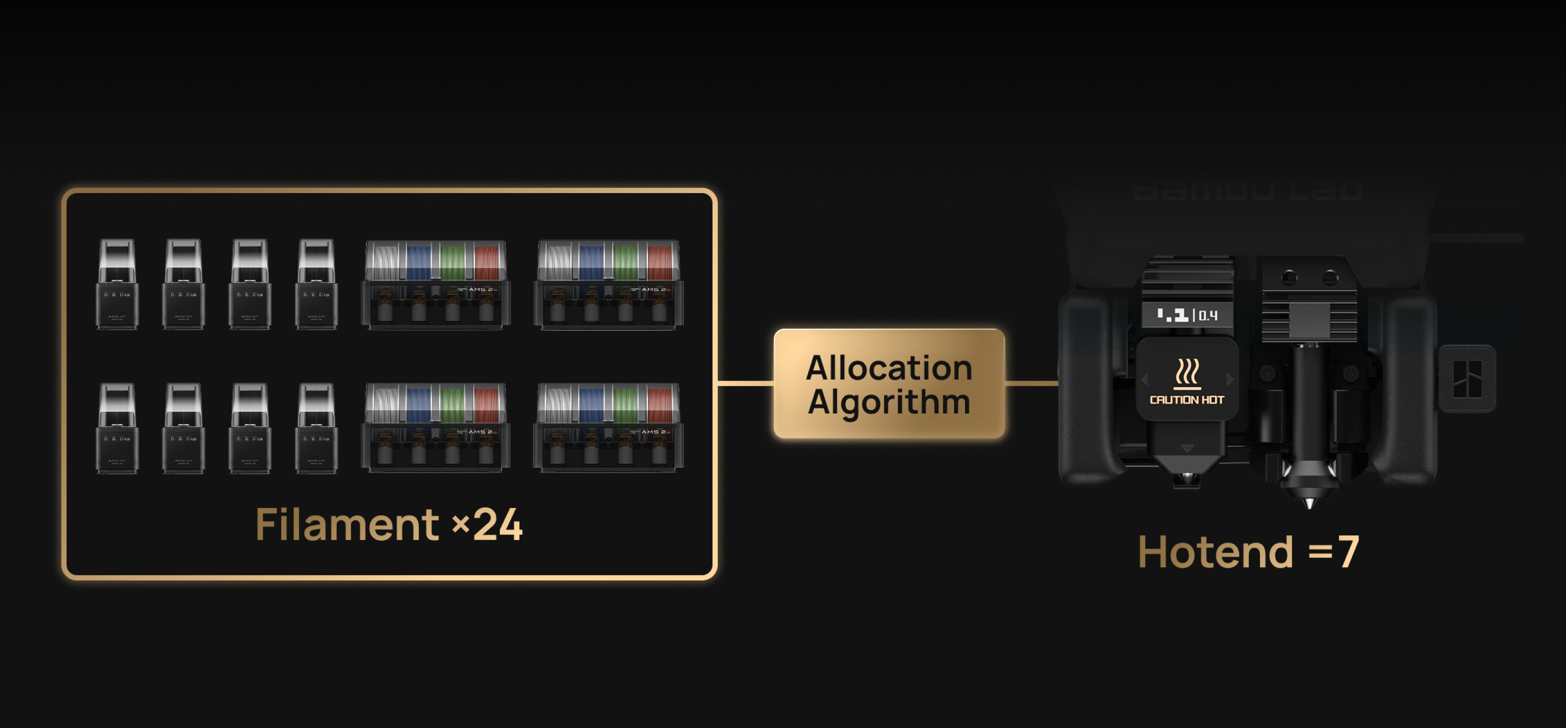Unlike tradtional toolchanger printers that limit colour count by the number of toolheads, the H2C supports up to 24 materials in a single print through parallel-connected AMS units. Its intelligent algorithm optimises filament-to-hotend allocation to minimise purge waste while delivering outstanding multi-colour and multi-material results.
